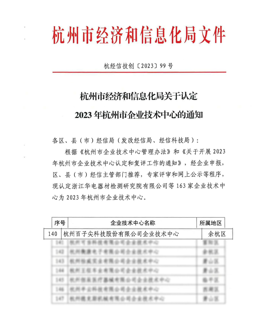 近日,杭州市经济和信息化局公布2023年杭州市企业技术中心名单,杭州百子尖科技股份有限公司成功通过认定。